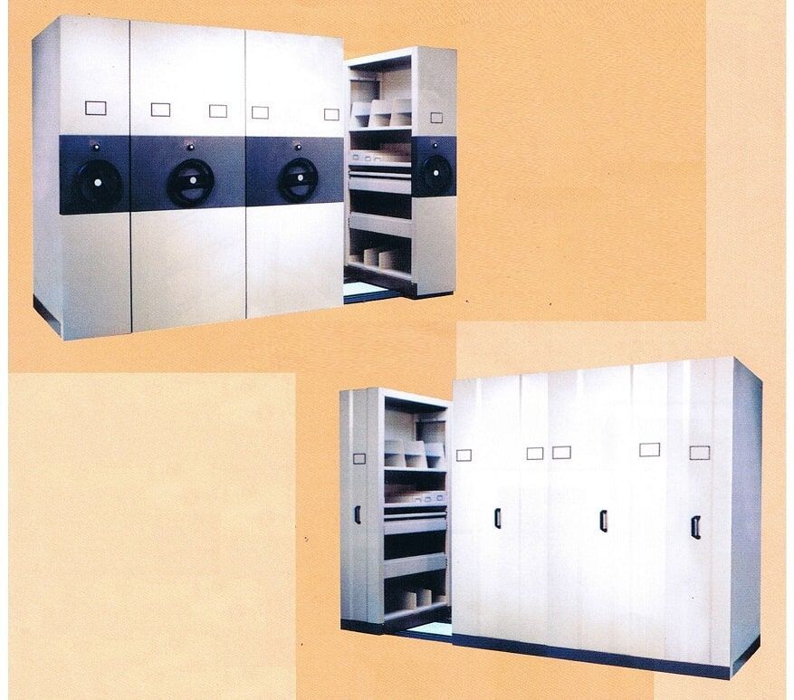 本公司生產之移動文件櫃 - 可分為 1) 手推式和 2) 手絞式 (機動式) 兩種,其特性可儲存大量檔案,節省作業走道,增加管理效益。多功能活動文件櫃,可省力輕巧地移動沉重的文件。多座連體配置及其活動層板和配件,可按客戶需要而隨意調整,方便靈活。
